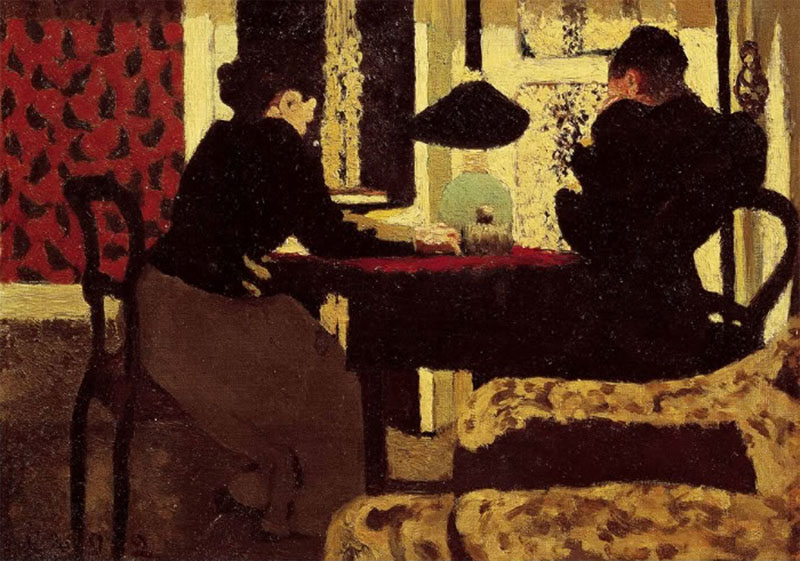 In painting after painting, on small pieces of brown cardboard, using thick paint and layers of theatrical glue used in stage sets, Vuillard showed that in the crowded rooms, the routine domestic activities, there is the romance of the wide, mysterious world: opposites as one.